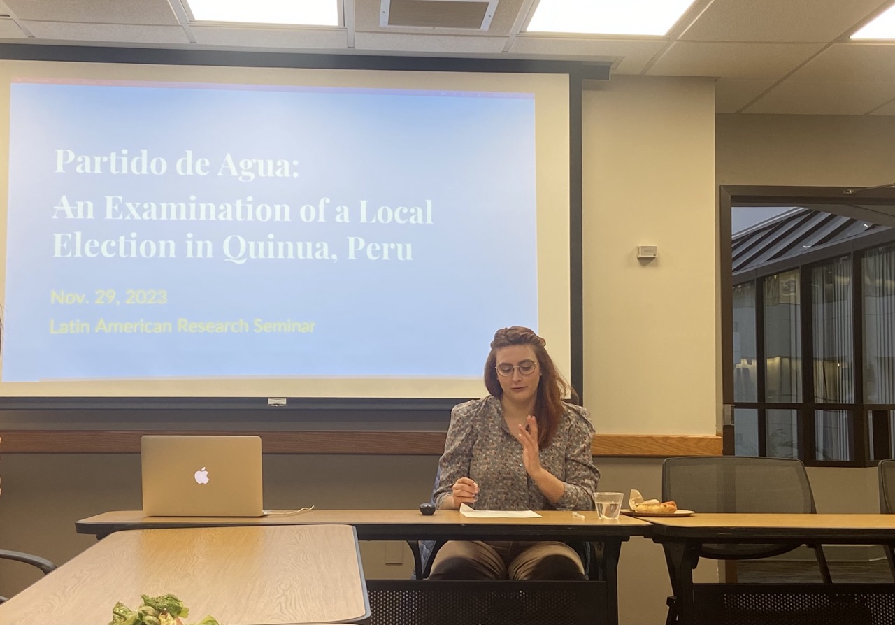 On November 29, 2023, Ph.D. candidate Calla “Cici” Cameron from the Department of History shared her research experience in Ayacucho, Peru, as she followed a local mayoral election and participated in the campaigning process. This election, which took place in 2022, serves as an example of the role history plays in modern politics, as it was heavily influenced by the collective memory of war and violence, as well as familial ties and language. Calla found herself as an important figure in the election after friends and community members presented her as a diplomatic tie to the United States. After the presentation, students and faculty members asked Calla about the strategic use of Spanish and Quechua in the election, her role as an accidental participant in the campaign, and the ways in which community members viewed the candidates. To learn more about the project, please visit the LARS page. We thank Calla and the community for a productive and engaging conversation.