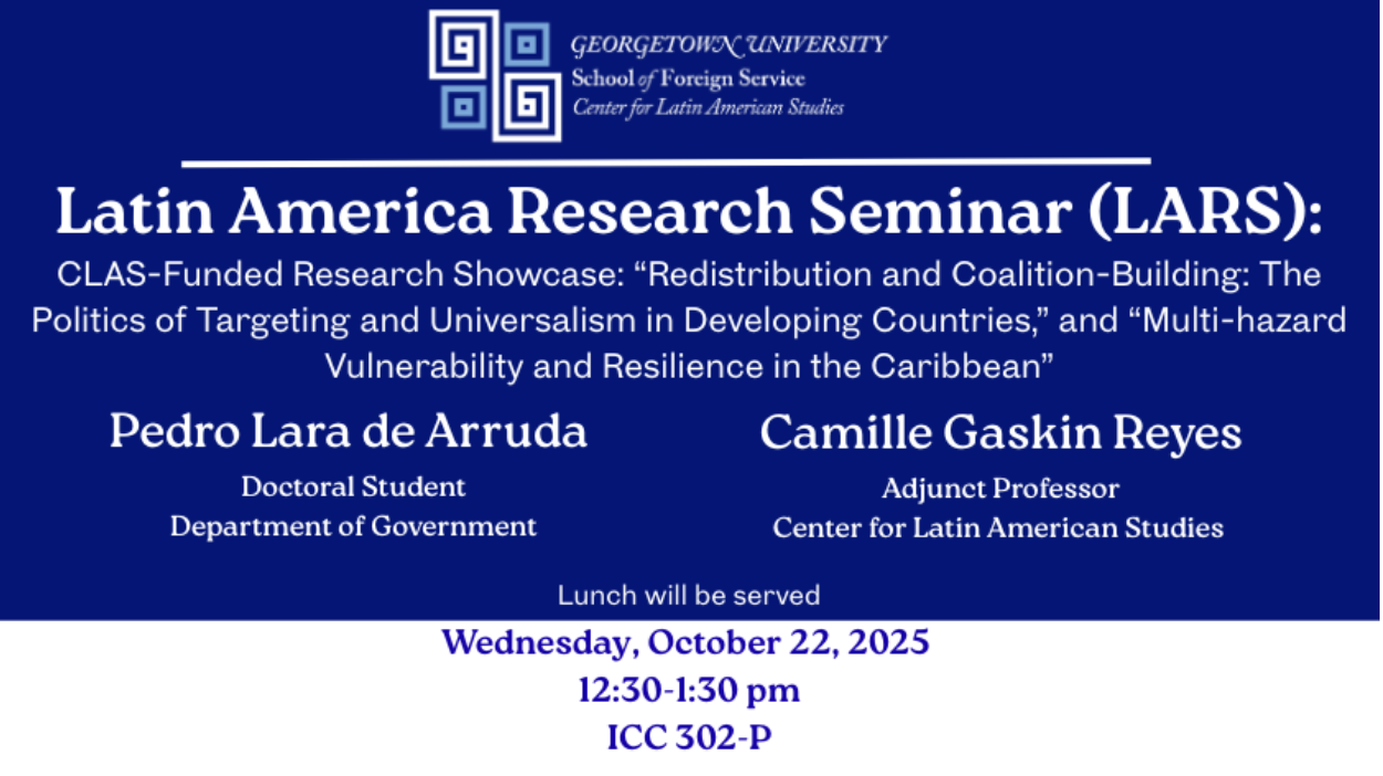 Both presenters will discuss research they have completed with the help of CLAS research funding. Georgetown University doctoral candidate Pedro Lara de Arruda presents his research on “Redistribution and Coalition-Building: The Politics of Targeting and Universalism in Developing Countries,” while Adjunct Professor Camille Gaskin Reyes presents her research on “Multi-hazard Vulnerability and Resilience in the Caribbean.” Lunch will be served.